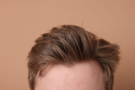 Man after hair loss treatment on beige background, closeup