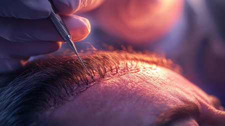 A close-up of a hair transplant procedure being performed on a patient in a clinic setting