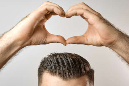 Man with modern and stylish haircut after barbershop shows heart sign near his head with copy space. Healthcare about hair. Mans beauty.