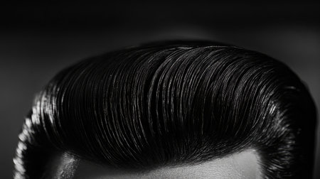 A striking close-up of a classic hairstyle in black and white, showcasing glossy texture and elegance, perfect for vintage fashion and grooming inspirations.