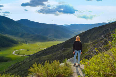 A young beautiful blonde girl standing on the edge of a cliff in the mountains of Altai on a bright sunny day