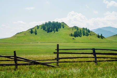Beautiful sunny landscape with green forest mountain and vast field with long fence. Hill with coniferous trees on top. Vivid scenery with flat field behind wood fence in mountains. Scenic alpine view