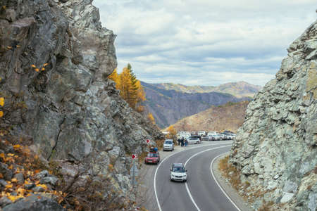 Several cars parked by mountain highway between rocks in autumn colors. Cars on mountain pass and autumn leaves on rocks. Russia, Altai Republic, Chuysky tract, Chike-Taman pass, September 19, 2020.