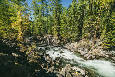 Scenic alpine landscape with powerful mountain river in forest among rocks in sunshine. Vivid autumn scenery with beautiful river in mountains in sunny day. Rapids on turbulent river near rocky wall.