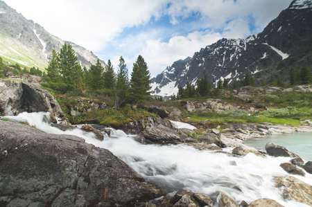 River among the high mountains. Picturesque landscape of rocky Altai mountains and Chulyshman river. Mountain range, river, green coast, blue sky and white clouds.