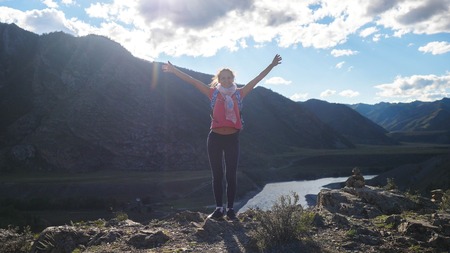 Woman at the river Katun at summer day. Trip on Altai Mountains in Altai Republic