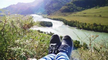 Female feet in running shoes sitting on top of mountain with amazing landscape on mountains river and beautiful sunflare effect