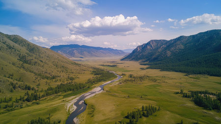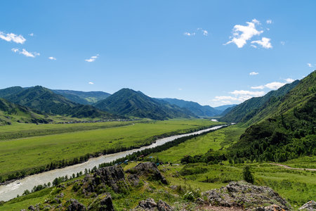 Breathtaking view of a river flowing through a lush green valley in the Altai Mountains, under a bright blue sky with scattered clouds
