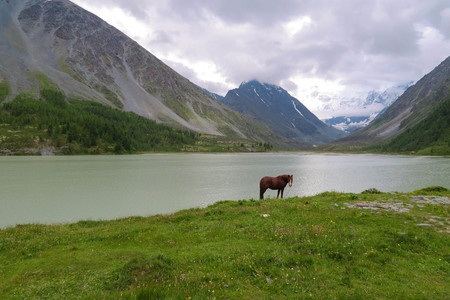Akkem lake. Altai Mountains landscape. Horse on the background