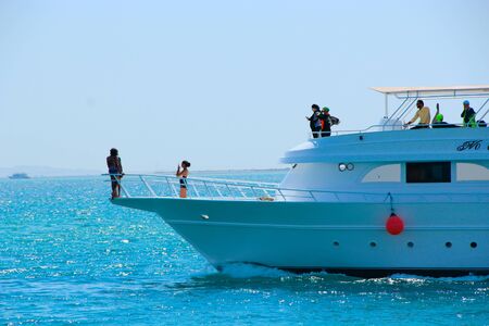 SHARM EL SHEIKH, EGYPT - JUNE 7, 2021: Luxury yacht with tourists in a bay of the Red Sea in Sharm El Sheikh in Egypt.