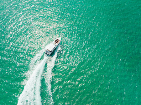 Aerial view of a small boat racing in the sea, travel and vacation concept