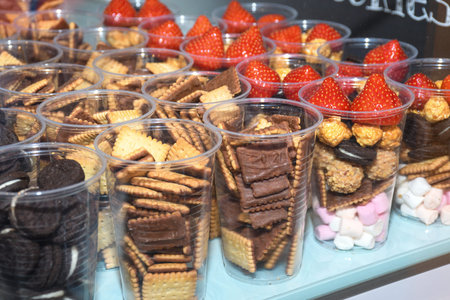 Red strawberries in a glass cup, along with biscuits, cupcakes, snacks ready to be served during brunch buffet event. Fresh Food Buffet Brunch Catering Dining Eating Party Sharing Concept