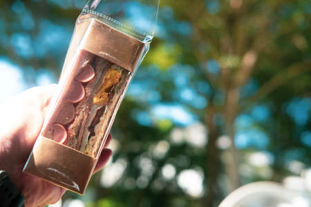 Cheesecake dessert with brown chocolate cookies in cup, at cafe.