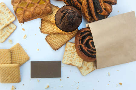 Salty snacks. Pretzels, chips, crackers and candy sweets. Unhealthy products. food bad for figure, skin, heart and teeth. Assortment of fast carbohydrates food.