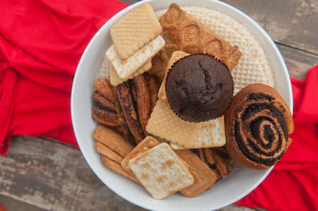 Bright pastries bowl on a wooden backdrop, old style rustic background