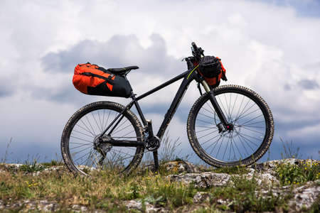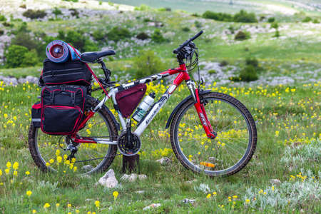 Plateau Karabi, Ukraine, May 2011: A lone mountain bike with a backpack stands on a hilly terrain. A concept of cycling travel, World Bicycle Day (June, 3). Equipment for cycling tourism.