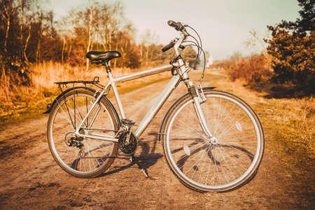 Bicycle near lake during sunset.Vintage bike near the lake in the evening, warm sunset view.