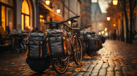 Modern electric bicycle equipped with bags stands on a trail through a misty autumn forest during a bikepacking adventure