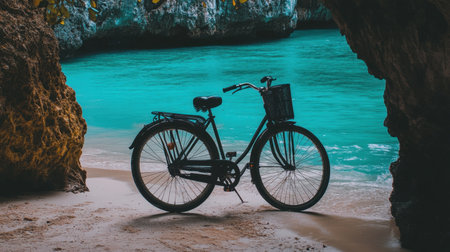 A serene composition featuring a bicycle resting on the sandy beach with turquoise water in the background, framed by rocky formations, perfect for evoking relaxation and adventure.