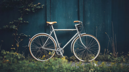 A charming vintage bicycle rests against a rustic green wall in an overgrown garden, capturing a serene moment filled with nature and nostalgia.