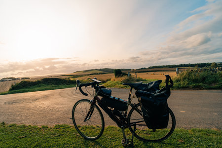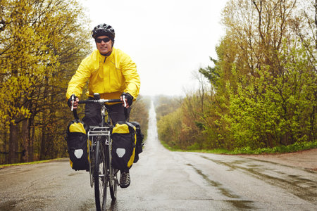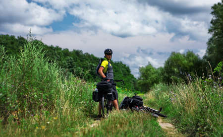 Mature bicycle tourist with his loaded bike on an asphalt autumn road