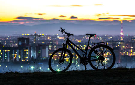 Modern sports city bicycle standing alone over night city background with many bright lights.