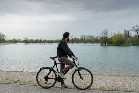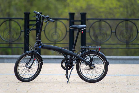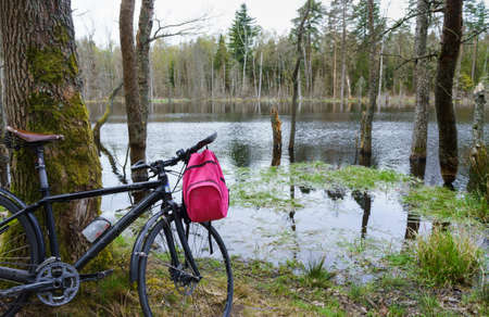 black bike on the shore of the pond, the bike near the tree, Kaliningrad region, Russia, April 26, 2020
