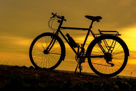silhouette of bicycle near lake and Sunset on beautiful sky. Romantic bike ride in nature.