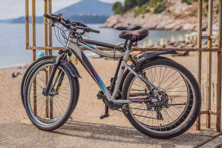 Bicycle stands at a metal railing against the background of the sea. A ladys bicycle is leaning against the shiny handrails. Cycling along the sea embankment