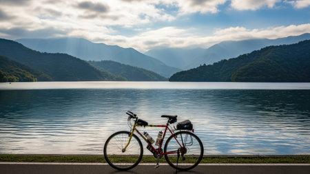 Active sunrise at the lake. Bike in a beautiful colorful scenery.