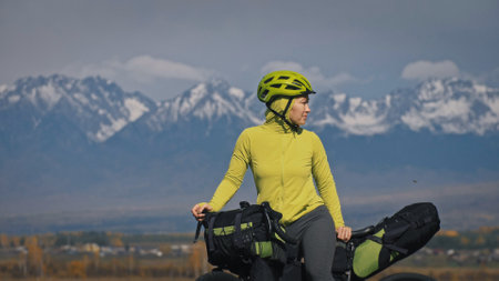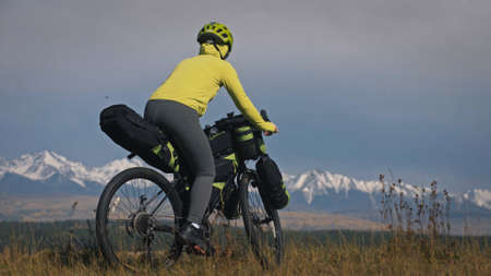 The woman travel on mixed terrain cycle touring with bikepacking. The traveler journey with bicycle bags. Sport tourism bikepacking, bike, sportswear in green black colors. Mountain snow capped.