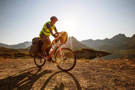 Traveler on bicycle. Solo travel long distance bicycle touring concept. High quality illustration