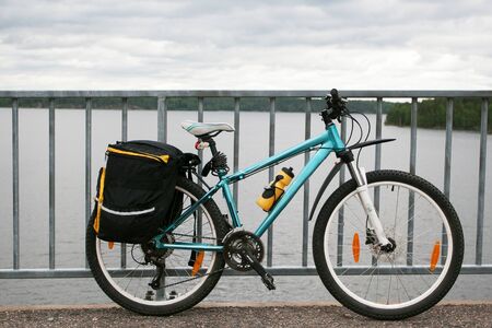 Light-blue all-terrain bicycle with pannier bags and yellow bottle standing infront of lake