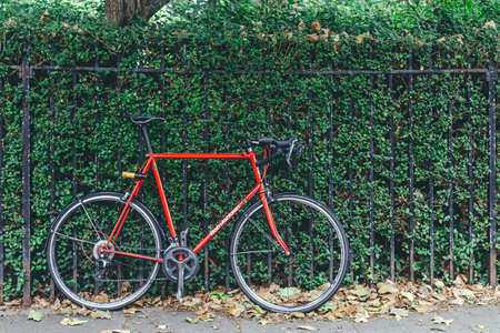 London/UK-30/7/18: the red bike chained to the fence on the side of a street in London