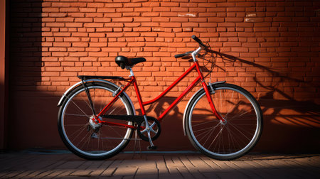 A classic bicycle rests against a textured brick wall in an outdoor setting, likely a street or public space. The image displays a vintage aesthetic with metal frame and leather seat. Soft sunlight bathes the scene, highlighting the details. Suitable for commercial projects or editorial use.