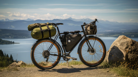 The woman travel on mixed terrain cycle touring with bikepacking. The traveler journey with bicycle bags. Sport tourism bikepacking.