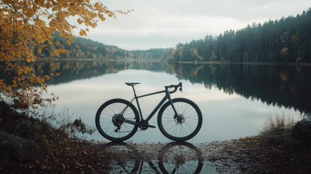 A modern gravel bike placed near a lake, reflecting in the calm water.