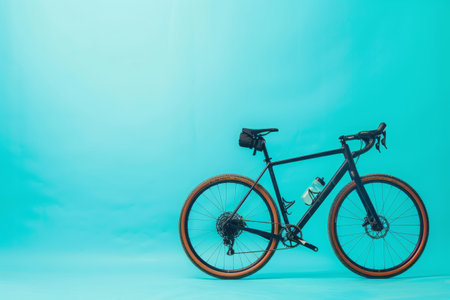 Gravel bike on blue background with copy space. Road sport bike, close up. Minimalist backdrop with bicycle