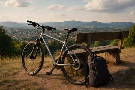 Cyclist taking a break on a bench with their mountain bike and backpack, enjoying a beautiful view of the valley below