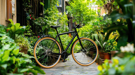 A black bicycle stands amidst lush green plants in an urban garden. This vibrant scene captures the essence of outdoor leisure, perfect for promoting eco-friendly travel and healthy lifestyles.