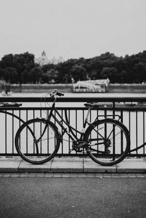 One mountain bikes propped on iron bridge next to beautiful river on autumn forest. The concept of outdoor activities recreation. Autumn mood. Close-up
