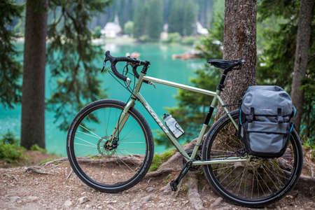 BRAIES, ITALY - Jul 21, 2016: colour image of a touring bike leaning on a tree near Braies Lake in South Tyrol, Italy
