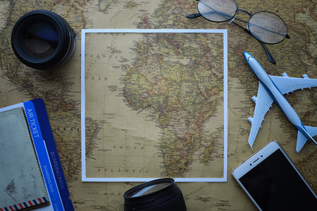 journey and release. Top view of a table in the airport lounge, passports, a cup of coffee, a camera and a map. vacation concept, airplane flight. Flatlay.