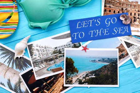 Bright pictures of summer vacation. Woman beach accessories, seashells, photos.