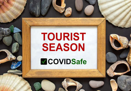 Wooden picture frame with inscription 'tourist season covidsafe' on beautiful black background. Sea stones and seashells. Concept.