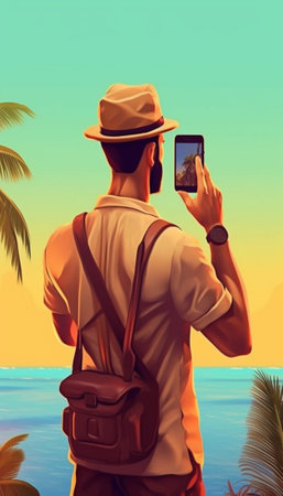 Generative AI : Handsome man with backpack taking a holiday selfie at tropical island palms in the background
