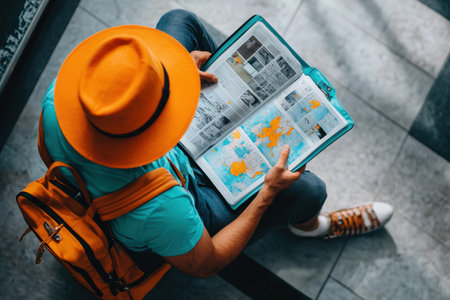 A backpacker finds a moment of calm sitting on the airport floor, expertly reading a map. Their orange hat and vibrant backpack add a splash of color to the travel scene, capturing the spirit of adventure and exploration.