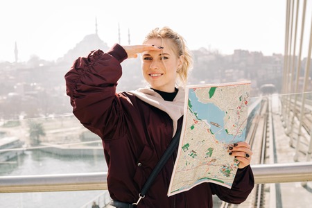 Happy friends looking at a map together on a sunny day. Travel, adventure, and friendship concept