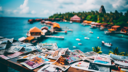 A note with text and a photograph from vacation, close-up. Concept on the topic of online tourism in quarantine