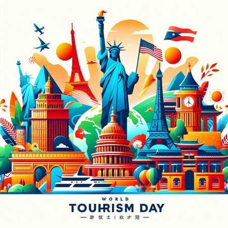 World Tourism Day banner with famous landmarks of the world. Vector illustration